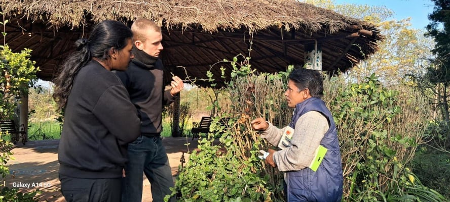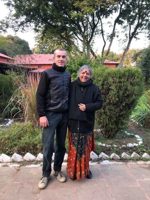 Im Dezember und Januar 2024 reiste Benjamin durch Indien, um seine Perspektive durch Yoga und Agro-Ökologie ganzheitlicher zu entwickeln. Während seiner Reise besuchte er Dr. Vandana Shiva auf ihrer Farm Navdanya im Norden Indiens. Die Trägerin des Alternativen Nobelpreises ist eine bekannte Sozialaktivistin und Kritikerin der Globalisierung, die sich für Umweltschutz, Frauenrechte und den Kampf gegen Hunger einsetzt. Auf ihrer Farm lernen Kleinbauern aus Indien, wie sie alte und widerstandsfähige Pflanzenarten nachhaltig anbauen können. Benjamin erlangte Einblicke in die nachhaltigen traditionellen Anbaumethoden der ökologischen Landwirtschaft und in die Praxis der Saatgut-Erhaltung in der Saatgutbank. In dieser werden ursprüngliche Samen für Kulturpflanzen gelagert, um sicherzustellen, dass die Menschen in Indien auch zukünftig genügend nährstoffreiche und nachhaltige Nahrungsmittel erhalten können.