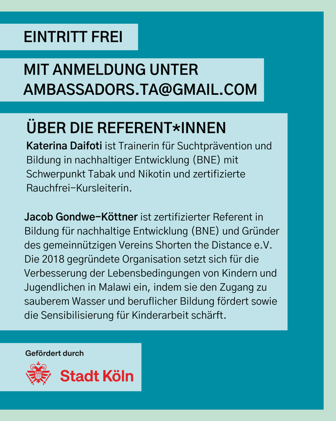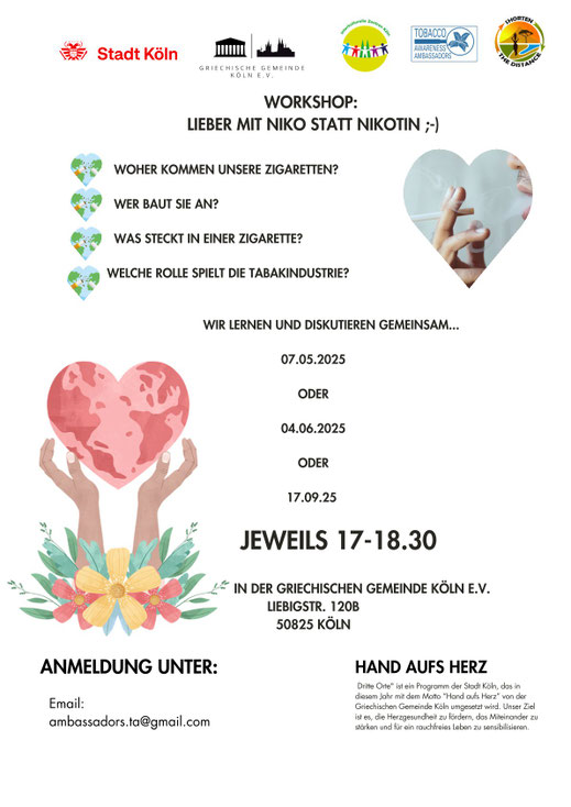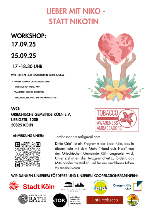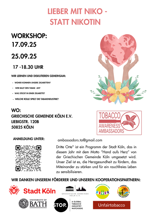 Im Rahmen des „Dritte Orte“-Projekts der Stadt Köln in der Griechischen Gemeinde Köln haben wir, als Tobacco Awareness Ambassadors, erfolgreich den Workshop „Lieber mit Niko – statt Nikotin“ durchgeführt.
