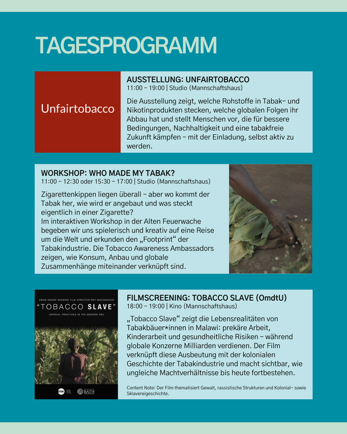Beim Thementag Tabak erwarten euch Ausstellung, Workshop und Film – ein ganzer Tag voller Wissen, Austausch und neuen Perspektiven.