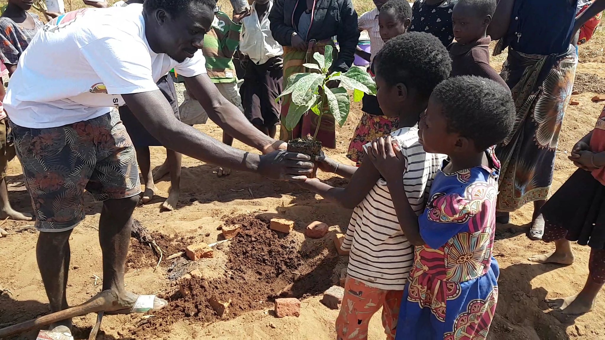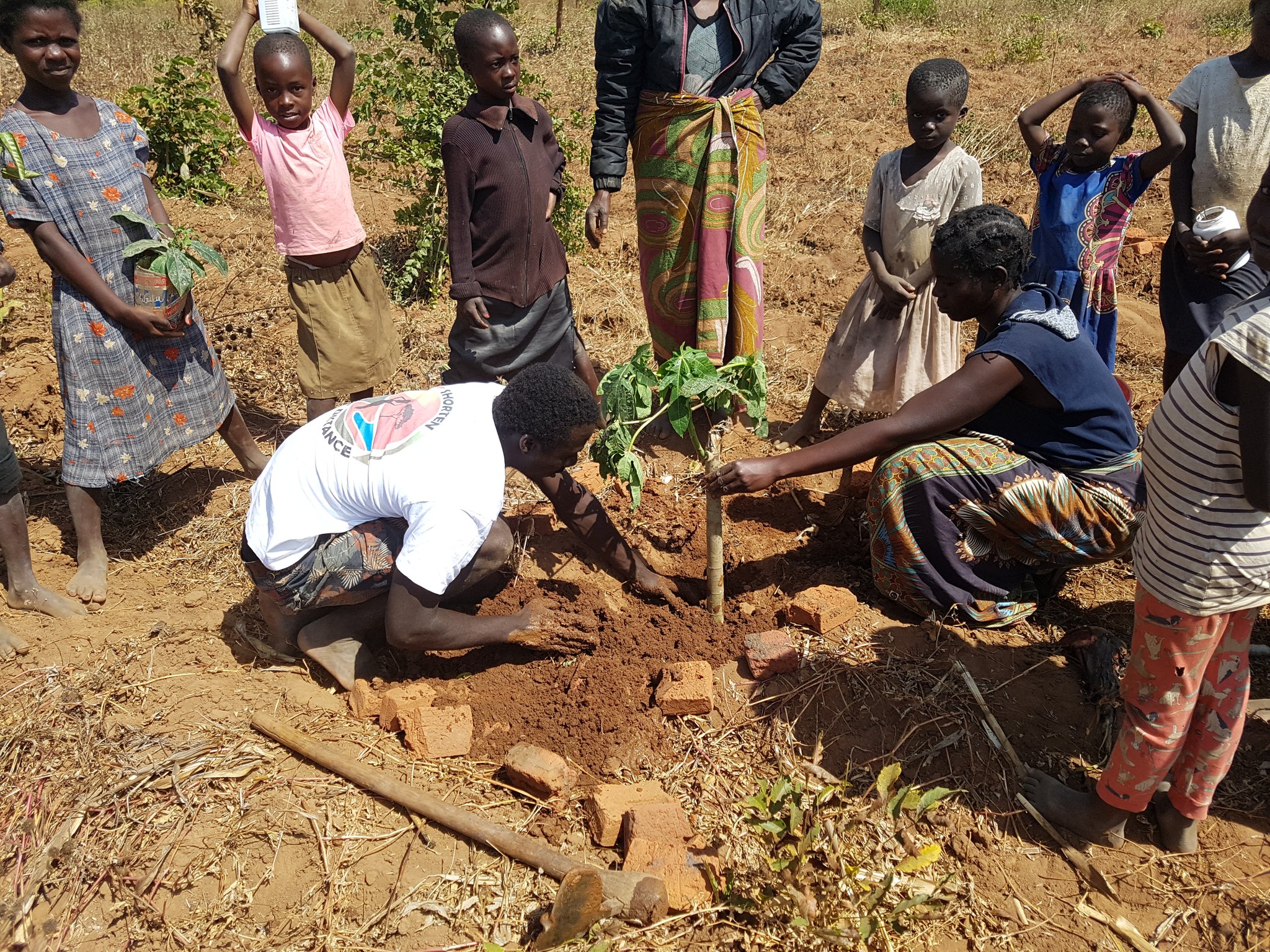 While the adults dug holes for the trees with a hoe and fetched water from the well, the children planted and watered the trees.